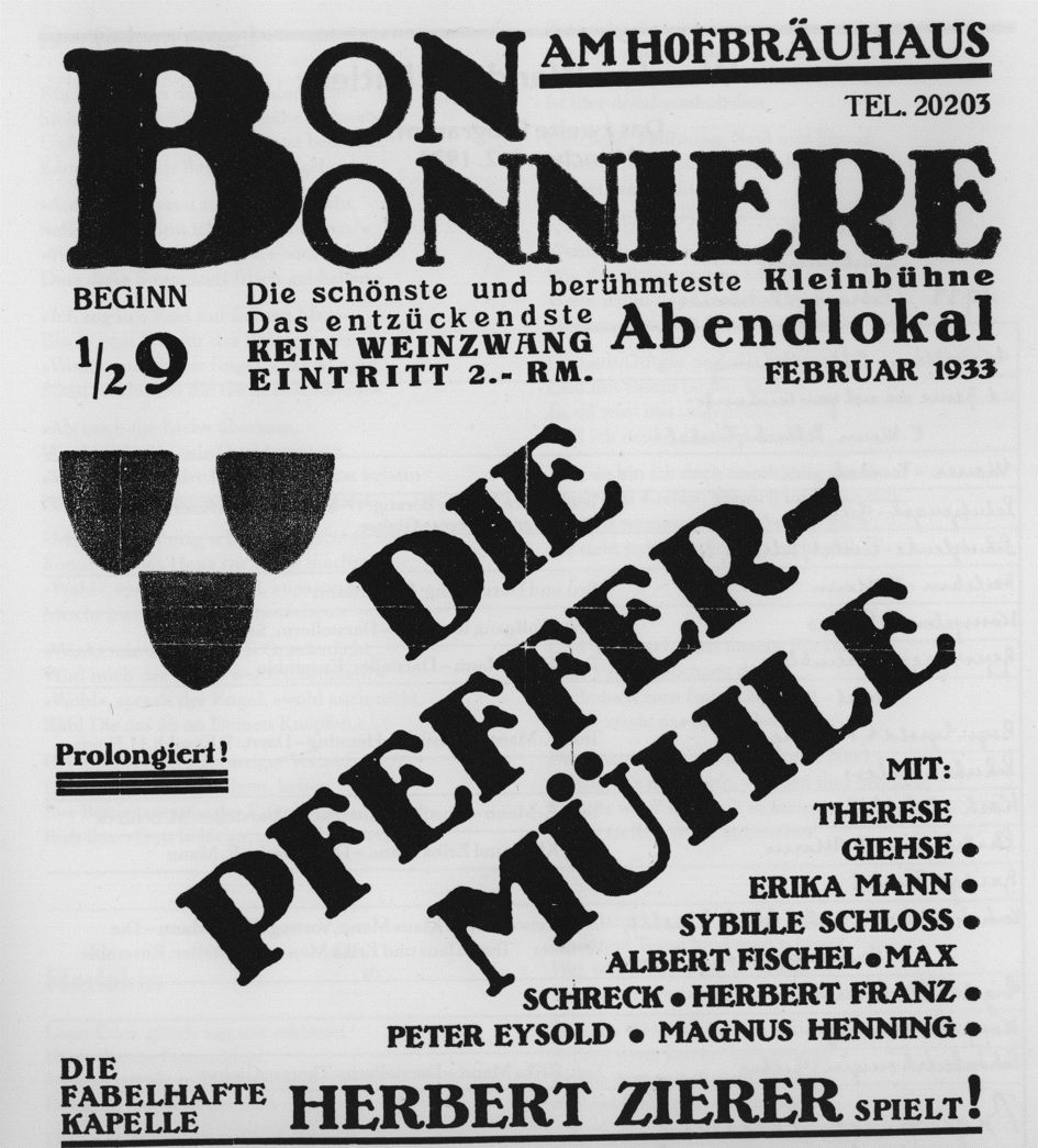 Erika Mann und Klaus Mann, zwei der Kinder von Thomas Mann und Katia Pringsheim, wurden Ende der 1920er Jahre durch den Kampf gegen den Aufstieg der NSDAP politisiert. Die Geschwister gründeten zusammen mit dem Musiker Magnus Henning das literarisch-politische Kabarett „Die Pfeffermühle“. Am 1. Januar 1933 fand die äußerst erfolgreiche Premiere in der Bonbonniere, einem Nachtlokal in der Nähe des Hofbräuhauses statt. Mit von der Partie war Therese Giese, die für einige Zeit die Lebensgefährtin von Erika Mann war.